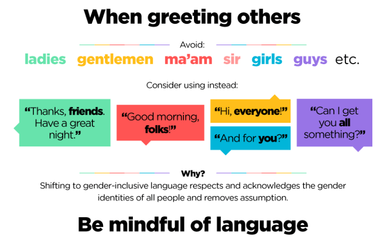- Start using genderless language to greet others.