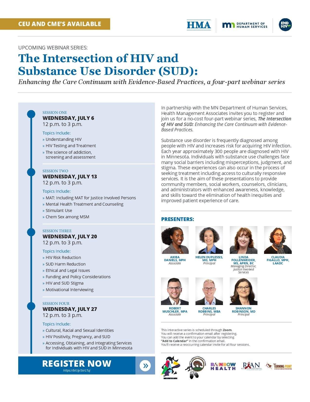 Session one will begin with the basics of understanding HIV, HIV testing and treatment, and the science of addiction, screening, and assessment. Session two will cover MAT for justice-involved individuals, mental health treatment and counseling, and stimulant use. Session three will cover HIV risk reduction, SUD harm reduction, ethical and legal issues, funding and policy considerations, and HIV and SUD stigma. The fourth and final session will address cultural, racial, and sexual identities, HIV positivity, pregnancy, and SUD, and accessing, obtaining, and integrating services for individuals with HIV and SUD in Minnesota.
