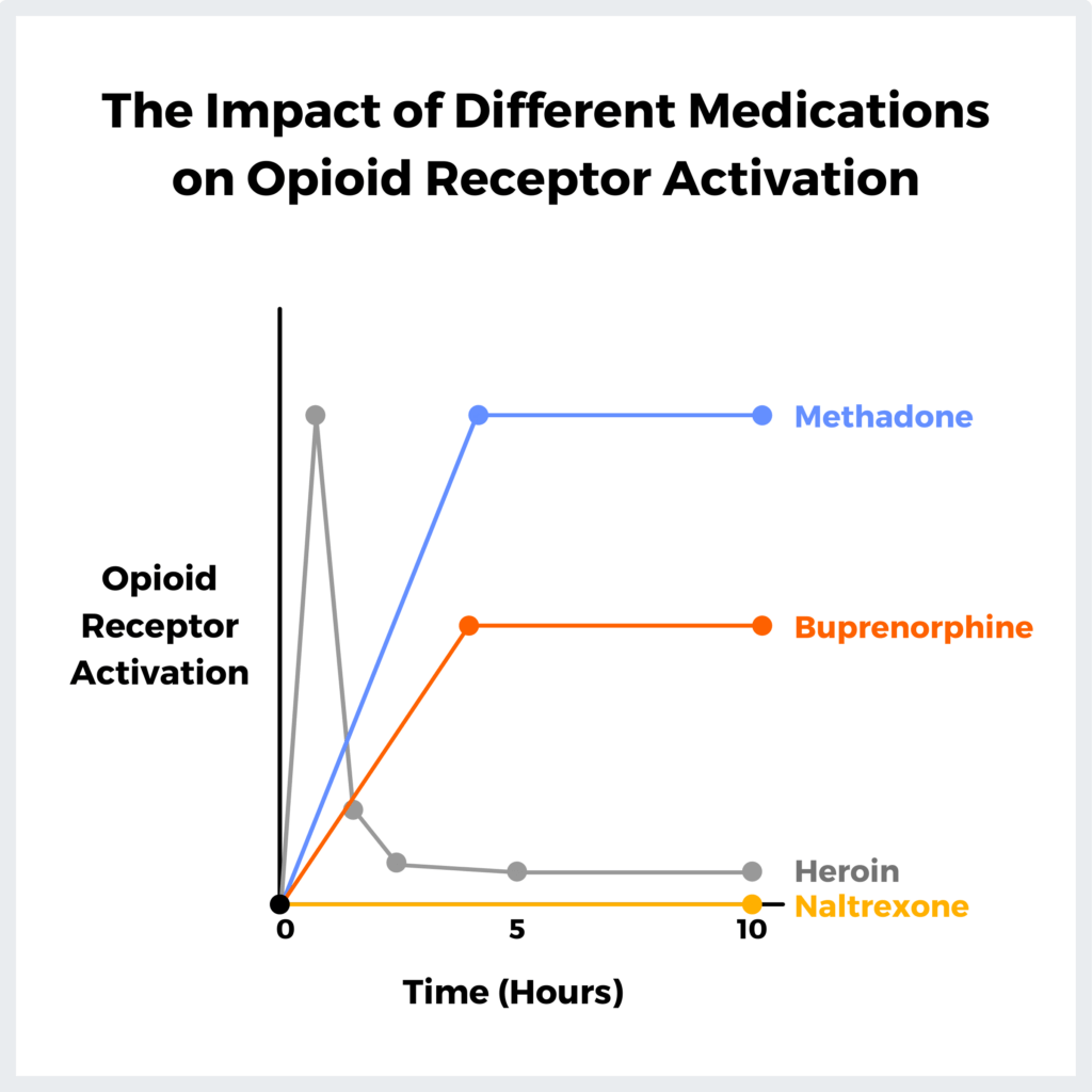 Agonists used therapeutically to maintain a more consistent rate of activation over longer time periods, reducing the effects of withdrawal. Heroin activates opioid receptors fully and quickly, with a steep drop-off. Methadone (blue) is also a full agonist, but the activation is much slower and longer lasting.